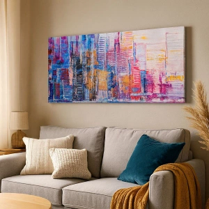 - Het schilderij toont een kleurrijk stadsgezicht met weerspiegelingen in het water, dat de vreugde en energie van een moderne metropool vastlegt. Het is de perfecte aanvulling op elk modern interieur.