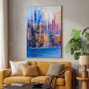 De compositie van het schilderij combineert verschillende tinten blauw, paars, oranje en roze, die samen een harmonieus geheel vormen. De abstracte weergave van gebouwen en hun weerspiegelingen in het water benadrukt de eigentijdse stijl van het werk, die perfect past bij moderne interieurs.