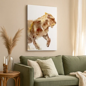 - Een artistieke interpretatie van een rennende leeuwin, dynamisch en subtiel in beige tinten. Een elegante decoratie voor liefhebbers van kunst en wildlife.
