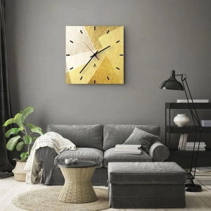 De klok is gemaakt van 4 mm dik gehard veiligheidsglas. De technologie van het maken van de klok voldoet aan de veiligheidsklasse 2B2 volgens de PN-EN 12600: 2004-norm, die weerstand tegen schokken garandeert. De klok op het glas is klaar om op te hangen - hij heeft een metalen hanger aan de achterkant van de klok en een schuimafstand die de even afstand tussen de klok en de muur regelt. De klok heeft een stil zwevend mechanisme dat wordt aangedreven door een batterij van 1,5 V - AA-batterij (batterij niet inbegrepen).