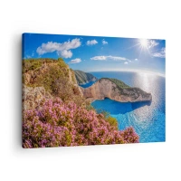 Schilderen op canvas - Een klif met bloemen, een turquoise zee en een zonnig Grieks landschap - 70x50cm - Mijn geweldige Griekse vakantie - Moderne wanddecoratie voor woonkamer en slaapkamer ARTTOR