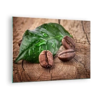 Schilderen op glas - Koffiebonen op een blad en houten achtergrond - 70x50cm - De meest ware en zwarte - Moderne wanddecoratie voor woonkamer en slaapkamer ARTTOR