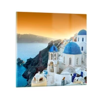 Schilderen op glas - Santorini - genesteld tegen de rotsen - 70x70 cm