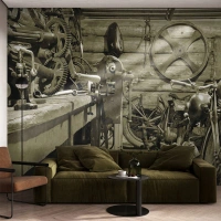 Fotobehang Standard Eco - Historische werkplaats met vintage motorfietsen - 100x70cm - In de schuur van oom Władek - Moderne wanddecoratie voor woonkamer en slaapkamer ARTTOR