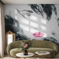 Fotobehang Standard Eco - Aandacht! Femme fatale - Abstractie, Het gezicht van de vrouw, Portret van een vrouw - 450x315 cm
