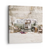 Schilderen op glas - Het interieur van een camperbusje in een woestijnachtige omgeving, met boho- en natuurelementen. - 70x50cm - Er is de tijd om aan de reis te beginnen - Moderne wanddecoratie voor woonkamer en slaapkamer ARTTOR