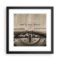 Wandklok - Klok - Close-up van een typemachine met de tekst What's Your Story? - 30x30cm - Vertel het mee - Moderne wanddecoratie voor woonkamer, keuken en slaapkamer ARTTOR