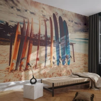 Fotobehang Standard Eco - Kleurrijke surfplanken op een zandstrand - 100x70cm - Weltrusten, zie je morgen - Moderne wanddecoratie voor woonkamer en slaapkamer ARTTOR