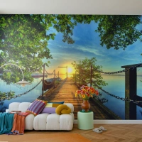 Fotobehang Standard Eco - Houten steiger op het meer bij zonsondergang - 100x70cm - Zonsondergang boven het water - Moderne wanddecoratie voor woonkamer en slaapkamer ARTTOR