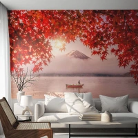Fotobehang Standard Eco - Een meer met een boot en een berg op de achtergrond, omringd door herfstbladeren - 100x70cm - In het Japanse klimaat - Moderne wanddecoratie voor woonkamer en slaapkamer ARTTOR