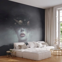 Fotobehang Standard Eco - Mysterieus portret van een vrouw met planeten in de mist - 100x70cm - En de planeten worden gek... - Moderne wanddecoratie voor woonkamer en slaapkamer ARTTOR