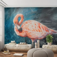 Fotobehang Standard Eco - Een flamingo tegen de achtergrond van een schilderachtige compositie in blauwtinten. - 100x70cm - Decoratief van aard - Moderne wanddecoratie voor woonkamer en slaapkamer ARTTOR