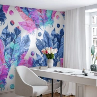 Zelfklevend Fotobehang Deluxe Sticker - Pluimen in roze en blauw - Vogelveer, Kleurrijke illustratie, Grafisch - 350x256 cm