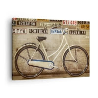 Schilderen op canvas - Een retrofiets tegen een muur versierd met kentekenplaten - 70x50cm - Zonder complexen - Moderne wanddecoratie voor woonkamer en slaapkamer ARTTOR