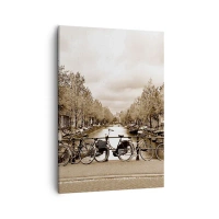 Poster in een zwarte lijst - Sepiakleurige fietsen langs het kanaal - 50x70cm - Hollandse sfeer - Moderne wanddecoratie voor woonkamer en slaapkamer ARTTOR