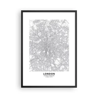 Poster in een zwarte lijst - Zwart-witkaart van Londen met nauwkeurige straatdetails - 50x70cm - Kaart van het doolhof van Londen - Moderne wanddecoratie voor woonkamer en slaapkamer ARTTOR