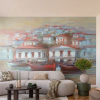 Fotobehang Standard Eco - Gelukkige stad - Architectuur, Zeilboot, Haven - 300x210 cm