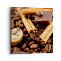 Schilderen op canvas - Koffiebonen met kaneelstokjes, chocolade en walnoot. - 70x50cm - Concert van aroma's - Moderne wanddecoratie voor woonkamer en slaapkamer ARTTOR