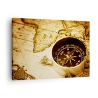 Schilderen op canvas - Een antiek kompas tegen de achtergrond van een oude wereldkaart - 70x50cm - Oost of west? - Moderne wanddecoratie voor woonkamer en slaapkamer ARTTOR