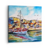 Schilderen op glas - Een kleurrijke jachthaven met een zeilboot en mediterrane architectuur - 70x50cm - Regenboogmiddag - Moderne wanddecoratie voor woonkamer en slaapkamer ARTTOR