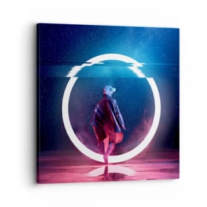 Schilderen op canvas - Een personage in een futuristische omgeving met een neoncirkel - 70x50cm - Tussen werelden - Moderne wanddecoratie voor woonkamer en slaapkamer ARTTOR